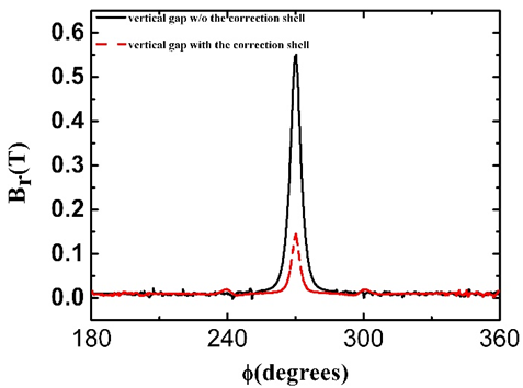The two neighbor parts besides one vertical gap are short circuited. The simulation result of the advantage of this correction shell is illustrated in in figure 5. The two lines show the radial field distribution from 180o to 360o at the edge of plasma, while the position of one vertical gap is at 270o. One can see that radial magnetic field is greatly reduced by around 70% with the correction shell. To further reduce the error field near the vertical gap, 24 small saddle coils will be installed over each vertical gaps to control the radial magnetic field in real time.