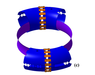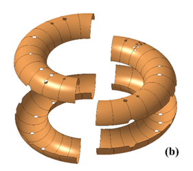 Figure4 (a) The final assembly of the whole conducting shell. (b) The four pieces of the primary shell. (c) The correction shell structure.