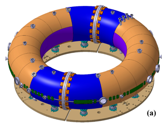 Modular shell structure, which is composed of one primary shell and one correction shell, is applied to KTX, as shown in figure 4. In order to guarantee a high plasma quality, a primary passive copper shell with a thickness of 1.5mm (20ms penetration time) will be attached tightly to, but insulated from the vacuum vessel to stabilize fast-growing MHD modes, especially in the current ramp-up phase. The primary shell consists of four pieces as shown in figure 4(b). The whole vacuum vessel is coated by a thin ceramic layer for insulation purpose, then the four copper pieces are attached closely to the vessel. The distance between the primary shell and outer surface of the vessel is 5mm, which allows enough space to accommodate magnetic field sensors while still maintains a small proximity. On the outboard side, the up and down pieces are connected and short circuited by bolted copper plates, while on the inboard side the up and down pieces are not connected to serve as a horizontal gap, which ensure the feasibility of possible PPCD research in the future. Two vertical gaps are also reserved in the primary shell, corresponding to the gaps in the vacuum vessel at the same toroidal locations. This primary shell structure provides the basic plasma equilibrium together with EQ coils during the current ramp phase. The small proximity of the primary shell also provide some benefits to stabilize the fast ideal MHD instability.