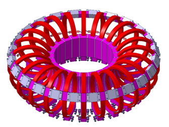 Figure 1. Three-dimensional view of the structure of TF coils of KTX. The silver blocks and the purple blocks between the red coils are used to support the coils and to counterbalance the torque due to the vertical magnetic field. It shows the toroidal field coils the support structures. The toroidal field ripple is defined as the ratio of the magnetic field componentperpendicular to the toroidal direction to the component in the toroidal direction. The maximum ripple occurs in the middle between the two TF coils.