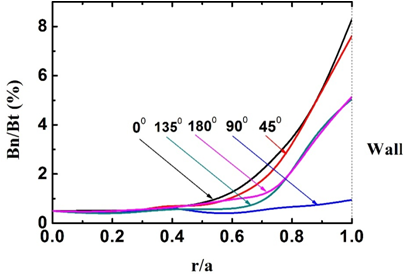 Figure 2:Toroidal magnetic field ripple profile along the radial position at different poloidal locations. The maximum ripple is at the outboard side at 00 in poloidal position, and the minimum ripple is at the up or down position of the vacuum vessel at 900 in the poloidal direction.