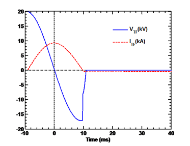 Three capacitor banks and high voltage thyristor switches are used in this circuit. A calculated waveform of the TF circuit is shown in figure 14. This set of power supply can also be used for low q discharges in tokamak configuration, while the optional switch is turned on to connection the crowbar to the circuit.