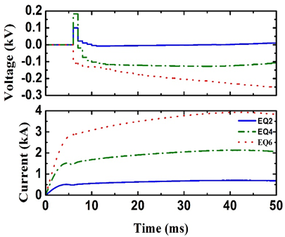 In an ideal situation, the currents in the EQ coils should increase proportional to the OH coil current or plasma current. Once the turns and locations of EQ coils are set, the mutual inductances among them are also fixed, and the ratios between plasma current and each EQ coil remain constant in the circuit modeling when the resistances of coils and plasma are ignored. When the circuit resistances are included, additional current drive is needed for each EQ coil to achieve the desired poloidal field configuration and magnitude that match the plasma current at all times. Due to the up-down symmetry of the EQ coils, six independent EQ power supplies are planned to control the coil current during the discharge. The EQ power supplies may be controlled by 1 kHz PWM (pulse width modulation) units to facilitate feedback position control. The EQ power supplies are not activated during plasma current ramping phase, because the rapidly changing plasma current would induce a high voltage on the EQ coils. During this phase the low voltage EQ power supply is actually bypassed to allow OH power supply to drive current through the EQ coils. In a circuit simulation of PWM control, the resistances of EQ coils and plasma are included for a 0.5MA plasma current. Those EQ power supplies are turned on at 7ms when the plasma current reaches its maximum. The waveforms of voltage and current for EQ2 coil, EQ4 coil and EQ6 coil power supply are shown in figure10. The peak voltage for the EQ power supplies is less than 350V and the peak current is less than 4kA.