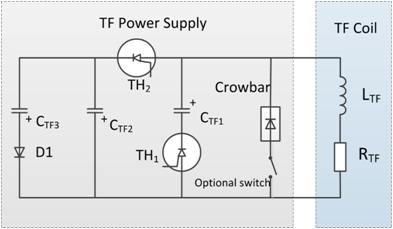 Figure 13. Schematic of the TF circuit. CTF1 is a reversible capacitor. The TH1 is switched off when TH2 is turned on for reversed toroidal field