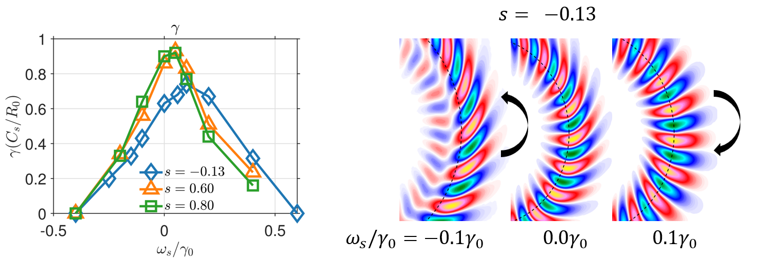 图1. 左图是不同磁剪切(s)下,ITG模式线性增长率与Er剪切率的关系;右图是弱反磁剪切条件下,不同Er剪切下的ITG模结构。