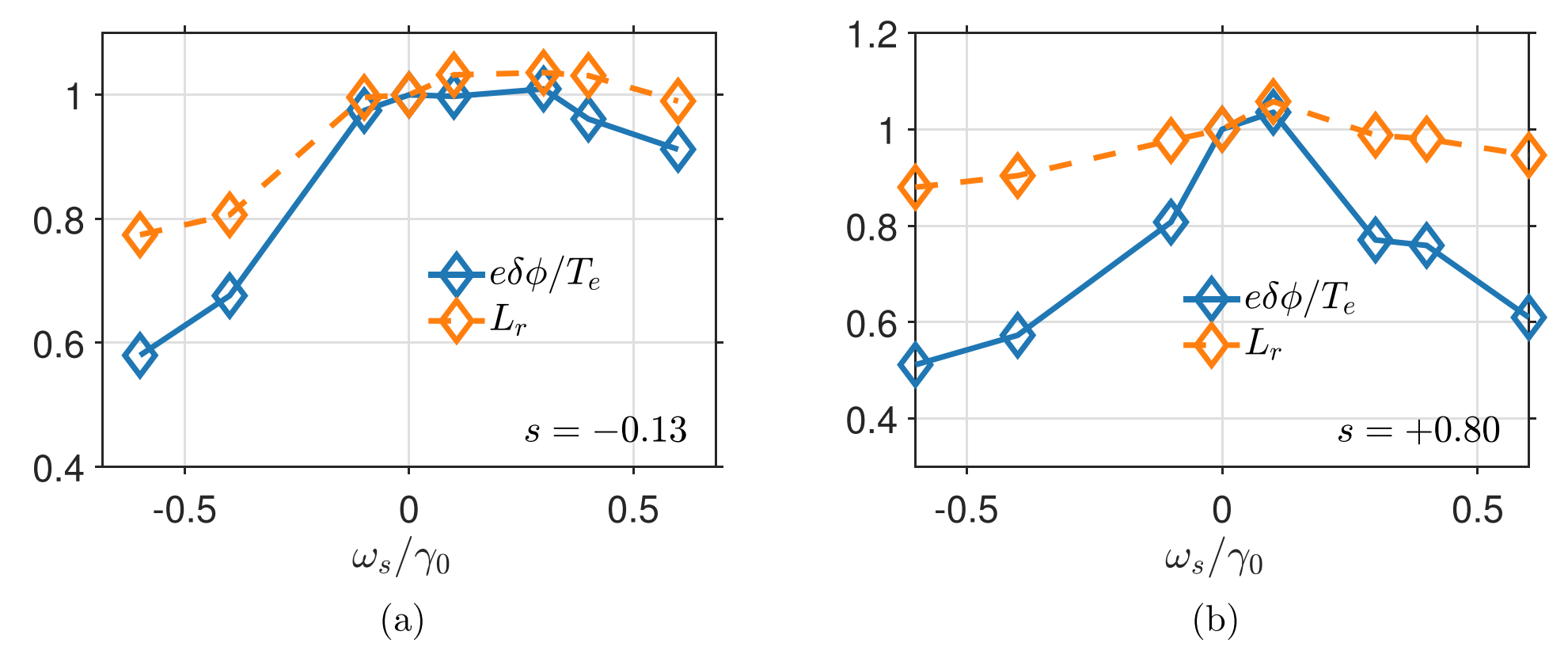 图2. (左)和(右)分别展示了磁剪切为和时,ITG扰动势和径向相关长度与Er剪切率的关系。