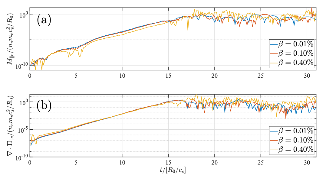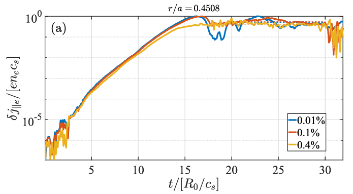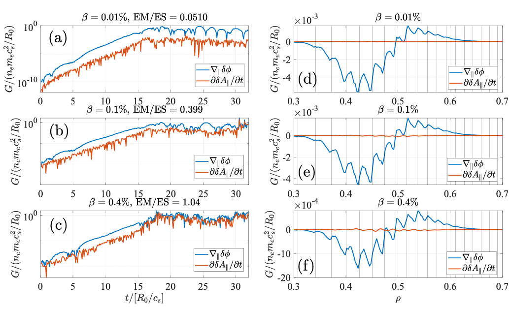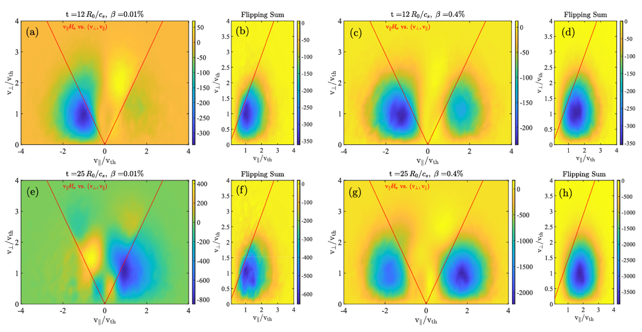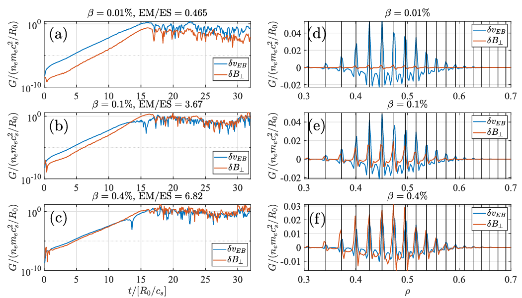 得益于GEM代码中任意波长求解方法,研究团队得以解析出仅相当于离子拉莫尔半径宽度的“电流尖峰”——这是一种紧贴有理面的径向电流结构。在单模模拟、比压β从0.01%升至0.4%的过程中,电流的强度几乎保持恒定,因此在这个范围之内,湍流驱动电流的幅度对电磁效应不敏感。单模结果显示,在线性阶段,湍流驱动电流主要由动量通量的散度驱动,尤其是其静电组分,而湍流加速项在所研究的β区间均保持次要地位;同时,在线性阶段中,尽管电流的驱动始终由动量通量的散度的静电分量占主导,但是动量通量的散度项和湍流加速项内部的电磁分量都随着电磁效应的增强而增强。更为细致的相空间诊断揭示,湍流驱动电流主要由通行粒子贡献,且随着电磁效应的增加,相空间的结构在平行速度的方向上愈加对称。
