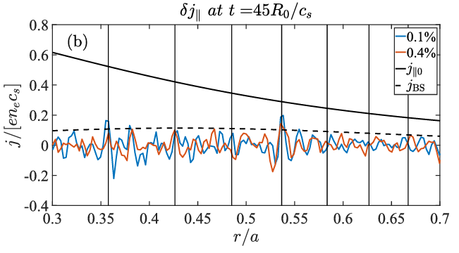 在多模模拟中,湍流电流呈现更为丰富的径向分布,更引人注目的是,在某些特定的位置,湍流驱动电流密度可达到平衡电流密度的同一量级,同时在某些特定的位置,其幅度会超过靴带电流。这一结果意味着,即便在文中研究的无碰撞极限下,湍流驱动电流足以在湍流的时间尺度下显著改变安全因子剖面,值得进一步深入研究。